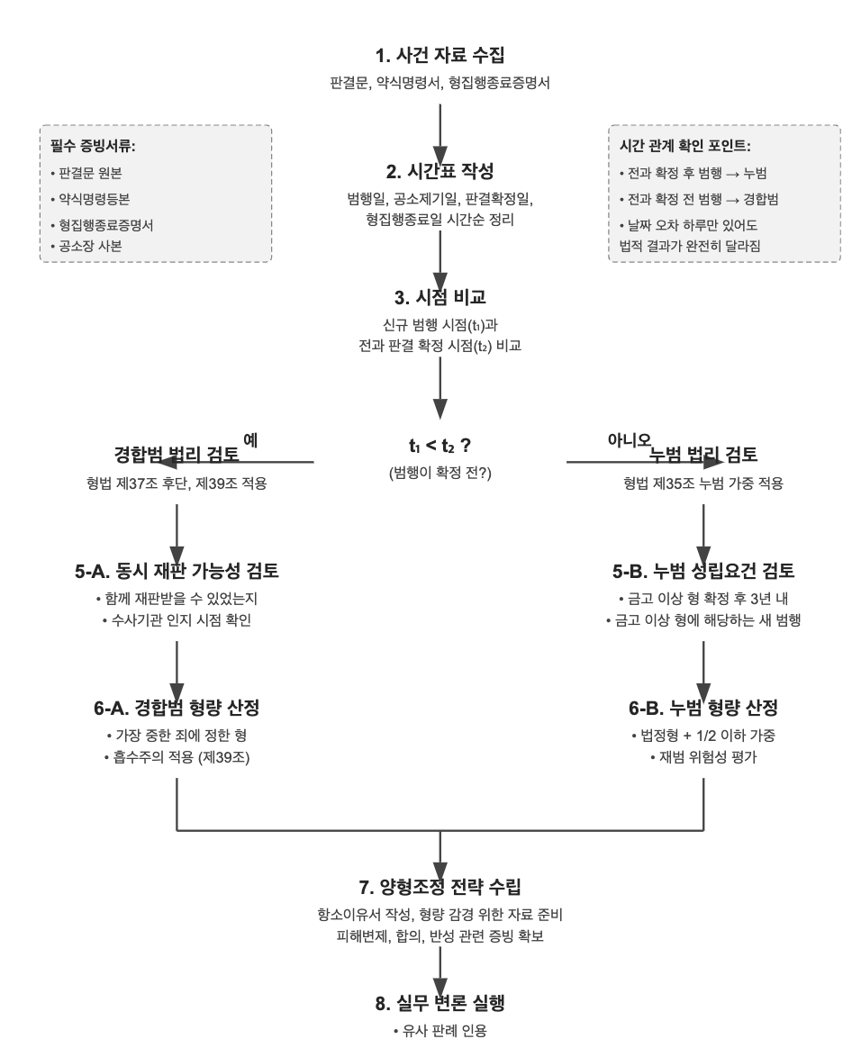 누범과 경합범의 법리적 구별론― 사기죄 선고형량에 관한 판례 분석과 실무상 쟁점 ― 본 서에서는 형사법 영역에서 빈번하게 문제되는 누범요건과 경합범 적용에 관한 법리적 쟁점을 검토한다. 특히 양형 산정에 핵심적 변수로 작용하는 두 요소의 구별기준과 실무적 함의를 서울고등법원 판결을 중심으로 분석한다. 형법 제35조 누범 가중과 제37조, 제39조에 근거한 경합범 처리의 실무적 적용지침을 사례중심으로 고찰하고자 한다. Ⅰ. 문제의 제기형사소송 실무에서 빈번하게 관찰되는 오류 중 하나는 누범과 경합범의 성립요건에 대한 불완전한 이해에 기인한다. 특히 범행시점과 전과확정시점 간의 시적 관계성에 대한 정밀한 판단 없이 기계적으로 전과 존재만을 근거로 누범 성립을 도출하는 1심 판결의 구조적 맹점이 지속적으로 발..